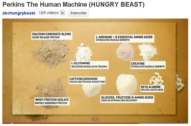 Just watched great youtube clip about what it takes for Shane Perkins to be a total 0-50km/h in 5s animal. They flashed up a pic of his daily supplement intake so I grabbed a still out of interest.