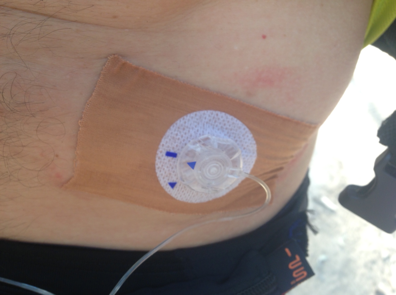Once I’d taken charge with a temporary measure and made sure it was being done as sensibly as possible, I got to thinking about a solution that would cope with the rest of the race. As an absolute fallback position, I could resort to slow-acting insulin that I’d left with my crew, but with the inability to reduce dosage once injected, and the high probability of nausea with its consequent effect on carb intake, this wasn’t my preferred outcome. The simple thing to do would be to use a sports tape more typically used for knees and ankles on my stomach to create a more easily adhered to surface for the next infusion. Cutting a small hole for the tubing to pass through and also sit closer to my skin might increase chances of success. Apparently the reaction from the race doctors when I texted my support crew asking for wide Leukoplast and a scalpel was a mixture of interest and concern.