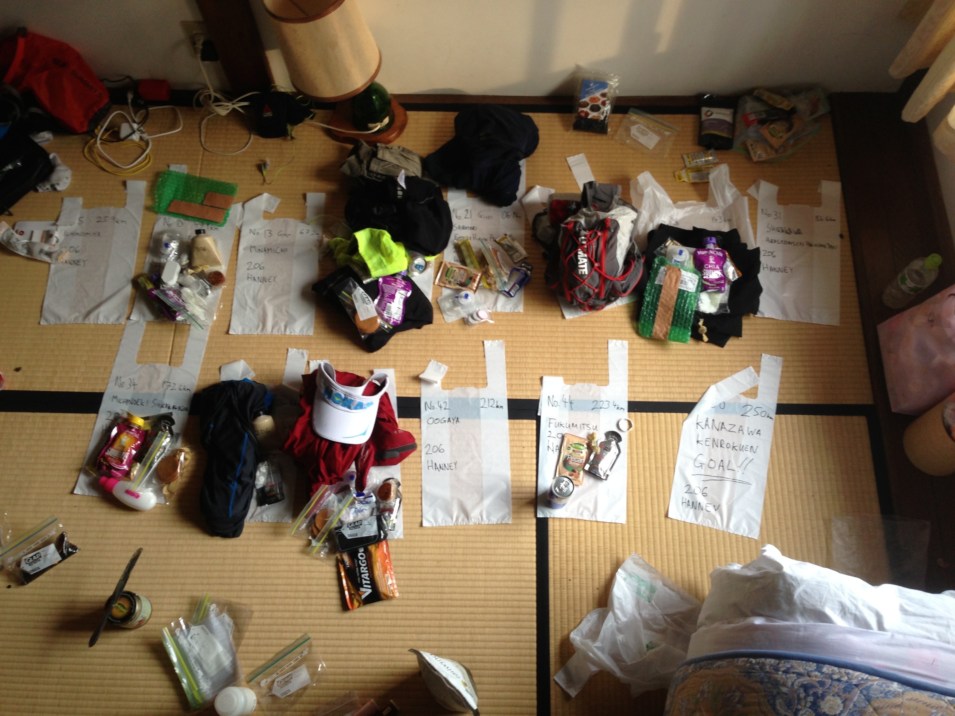 Wanting to cut straight to the run itself, this is probably a good point to say to any aspiring runners that Sakura Michi must be one of the best supported races in the world. There are approximately 42 aid stations, which are broken down into small (S), medium (M) and – that’s right – LARGE. These are also referred to as ‘Hotels’. Small has water, sports drink, maybe some candy or fruit. Medium has sports drink, water, maybe cola and candy, maybe red bean buns and umeboshi plums, maybe coffee or soup. The LARGE have everything! There are about 13 of these on course and they have EVERYTHING. These are also the aid stations where you can send your drop bags as you try to anticipate what you will need and when.
