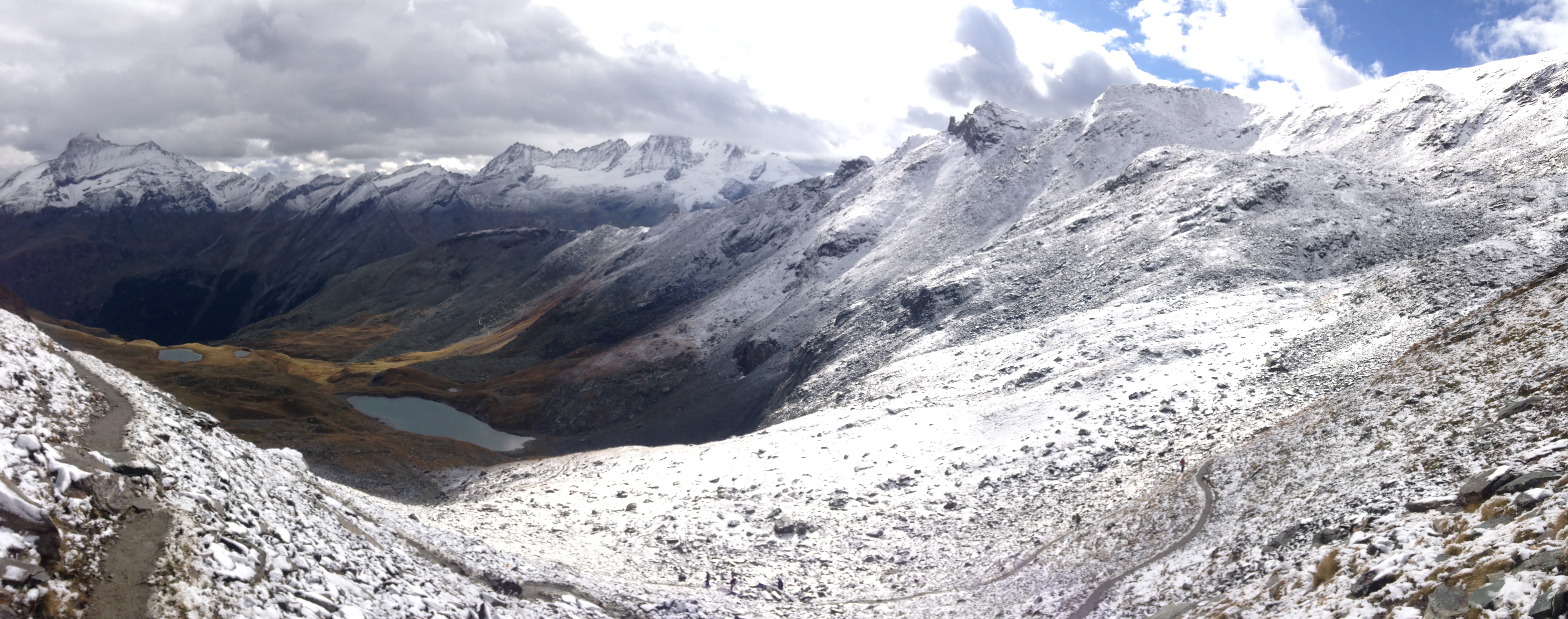 One of the remarkable things about alpine mountainscapes is how uniformly the snowline defines a particular altitude. We hit the straight edge of white at about 2400 metres, and shortly afterward the foot-and-a-half-wide trail we were moving along became sludge, then frosty sludge, and then more or less an inch-thick coating of ice with dirt and snow either side of it. We’d gone from Sound of Music to Mordor in under an hour. The higher you went, looking back every half hour or so to see how others were progressing, the less green or brown of grass would appear in your rear vision. Everything became white, grey, black.