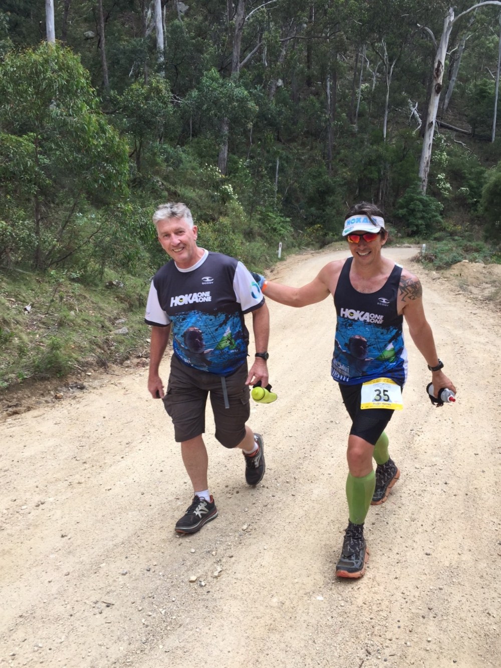 I was well and truly on Vitamin M by now, so with Brazilian death metal crunching away from my iPod I was enjoying everything. I’d had some tight niggles since early in the day but they seemed to be softening and spreading themselves more evenly throughout. Roland Hassall was running along with me at about the same pace so we HOKA’d him up with a wind jacket too. Hey Roland, shame it didn’t match your shoes bro 🙂 Next year buddy!