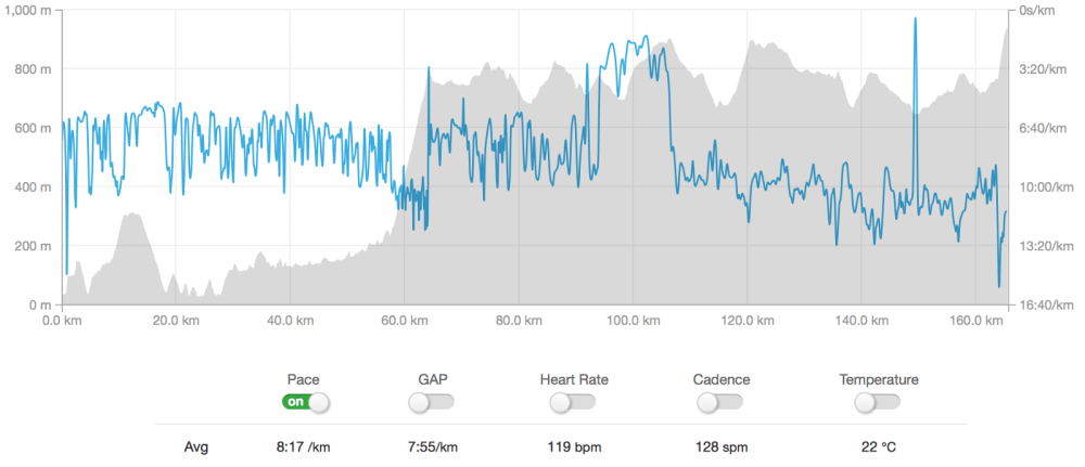 With time to think, there’s also always some kind of realization about how this race works, or running generally. For me this year, there was the epiphany that the race is about remaining calm. Do your miles calmly, eat calmly, drink calmly. Otherwise you get stuck in your head and even though you might feel like you’ve done 13 hours well, you’ve simply set yourself up to fail for the next 20 or 30. Trouble is, you won’t realise that you’re not being calm while you’re not being calm, it will only be a retrospective realisation once you start paying for your misjudgment.