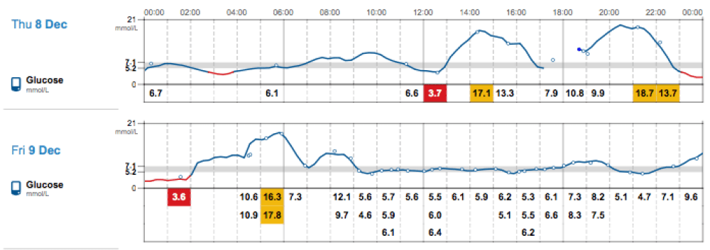 One of the key tools for any diabetic athlete is a new handheld device that scans the sugar from a sensor inserted into the arm. There is no blood, there is no sting, there is no need to protect anything from spilt sugars or sweat, and there is no 5-second delay. It also shows a graph of all that is going on over time, rather than single measures in isolation from each other. My sugars so far, about 9 hours in, were ridiculous. They looked like the fantasy graph that every type 1 would like but that nobody ever achieves in real life. This was great for peace of mind, physical performance and feel generally, as well as a sharp contrast to the year before.